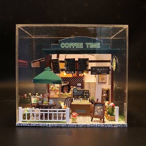 Miniature Doll House "Coffee Time" Shop (C006) w/LEDs Dust-proof Cover and Glue Present for Boys and Girls Wooden Crafts