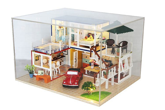 Dollhouse Wooden Furniture Kits 13842 'Container Home B' w/ Dust Proof Cover, LEDs and Glues, Handmade Gifts Birthday Presents