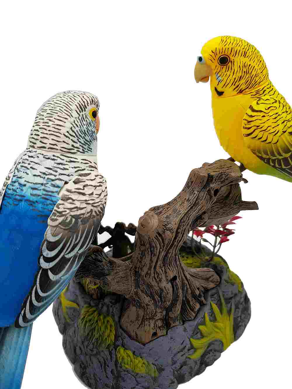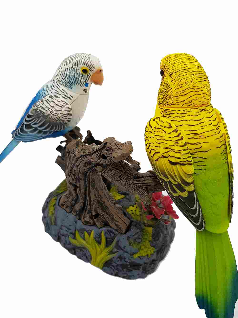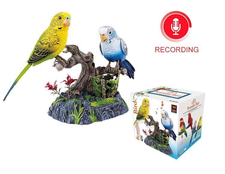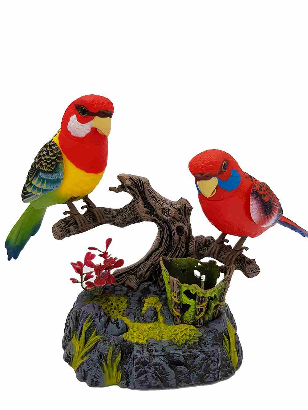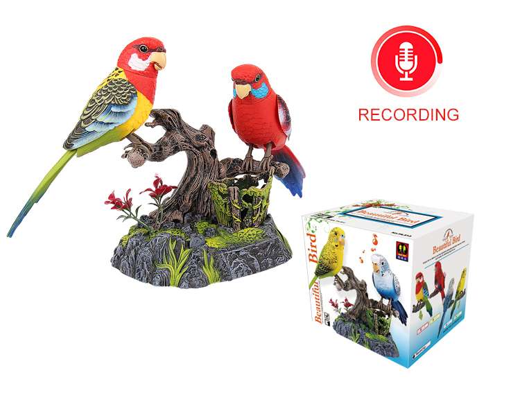 These parrot birds magically come alive whenever you clap your hands or make any sound. Standing on pen holder rock and log, the birds will sing, chirp, and talk in a wonderful voice and move their beak, neck, body, and wings in a realistic fashion.