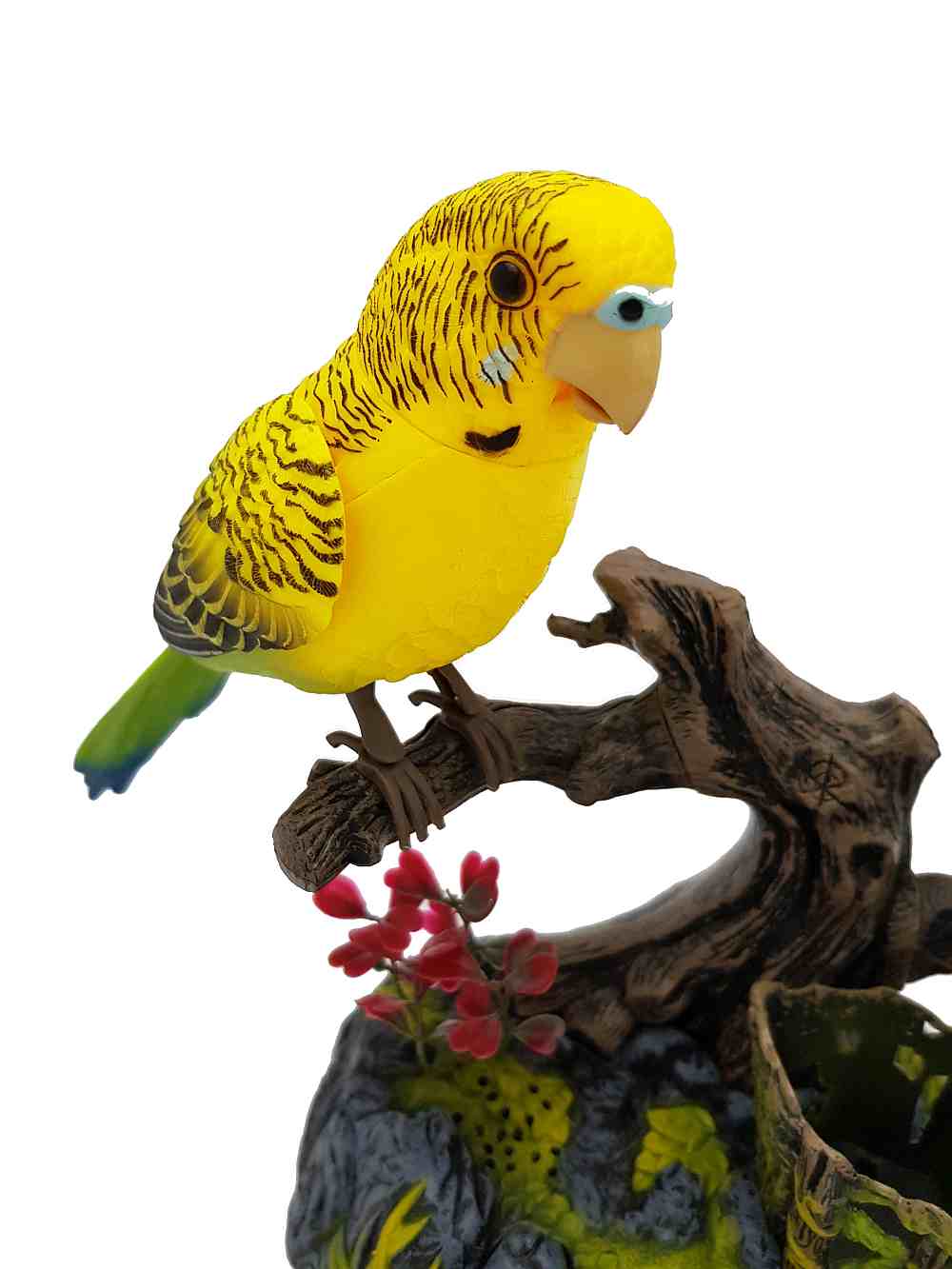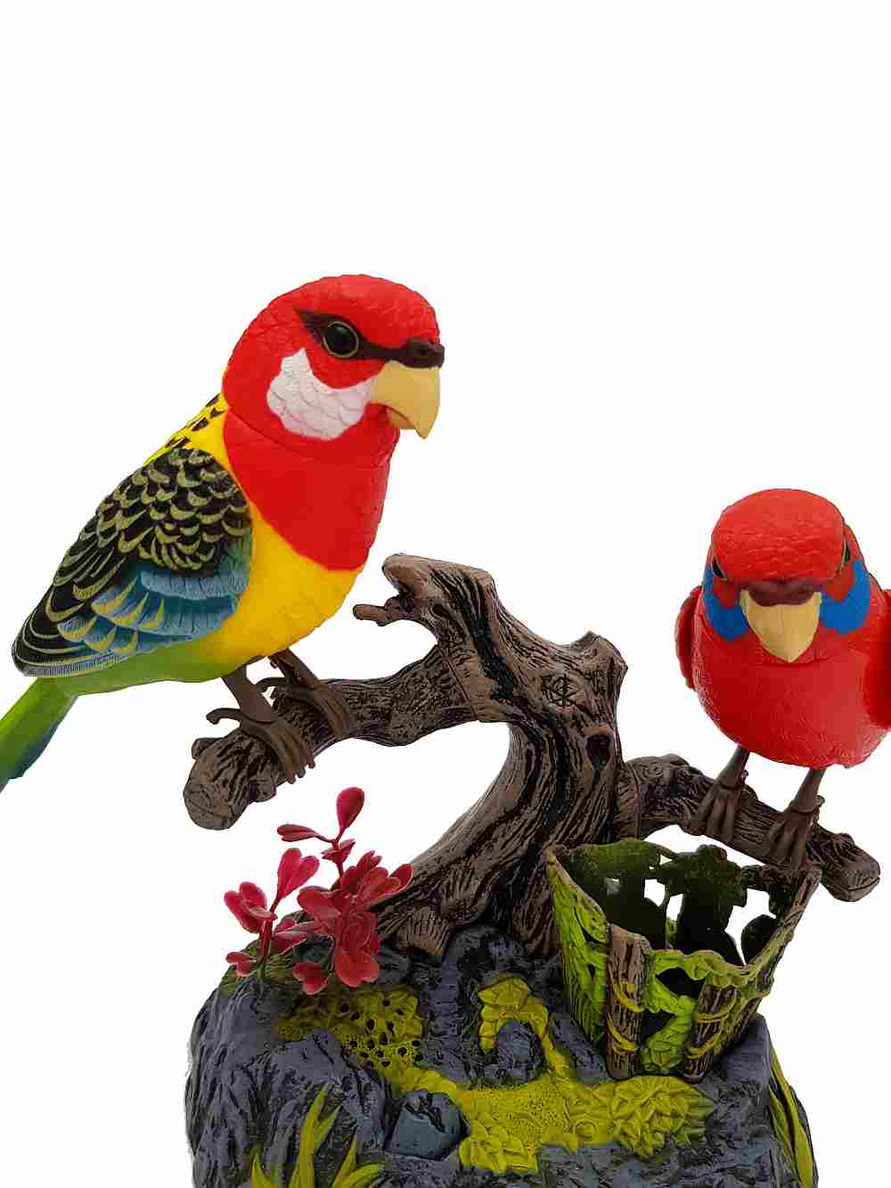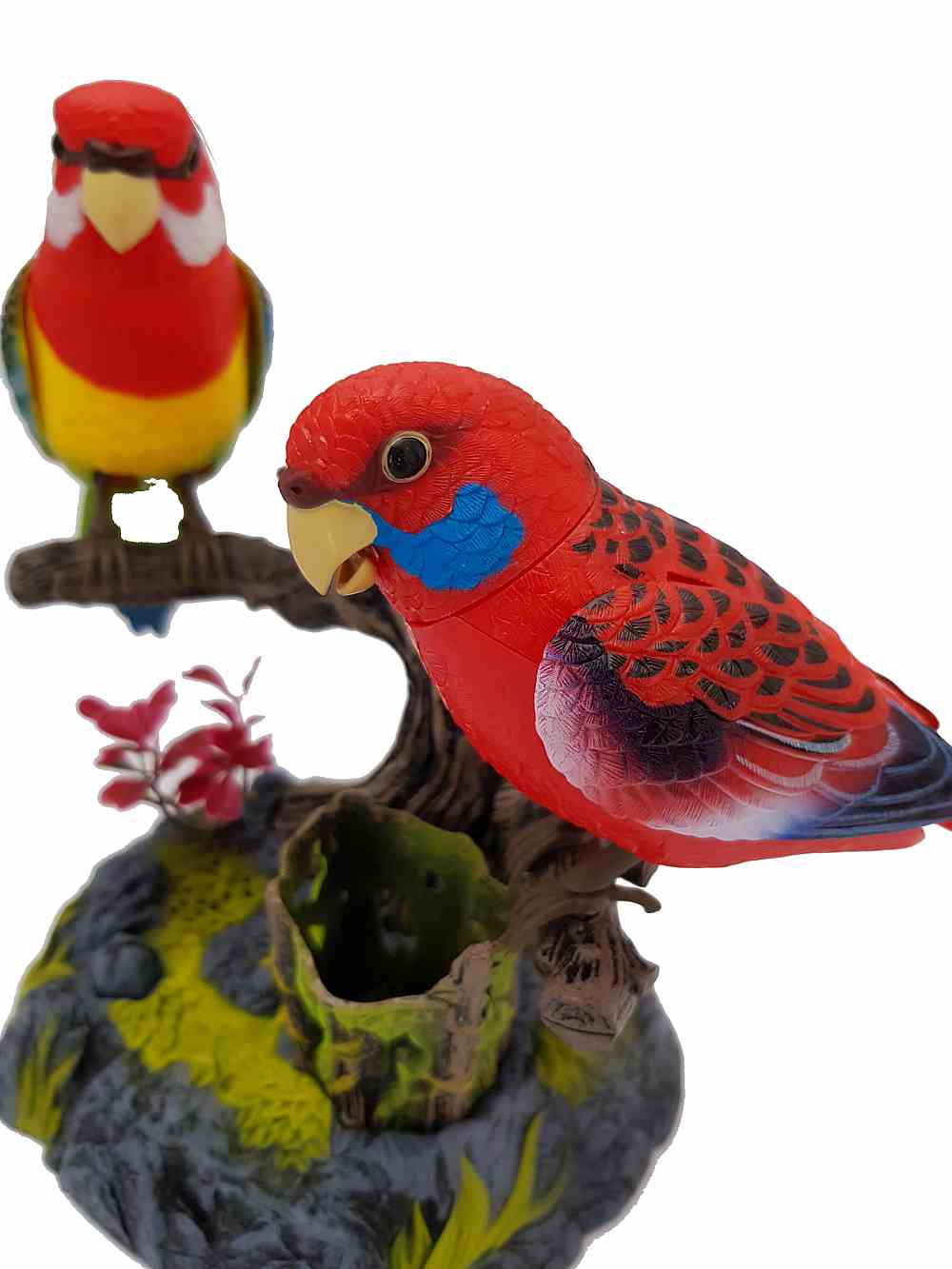 These parrot birds magically come alive whenever you clap your hands or make any sound. Standing on pen holder rock and log, the birds will sing, chirp, and talk in a wonderful voice and move their beak, neck, body, and wings in a realistic fashion.