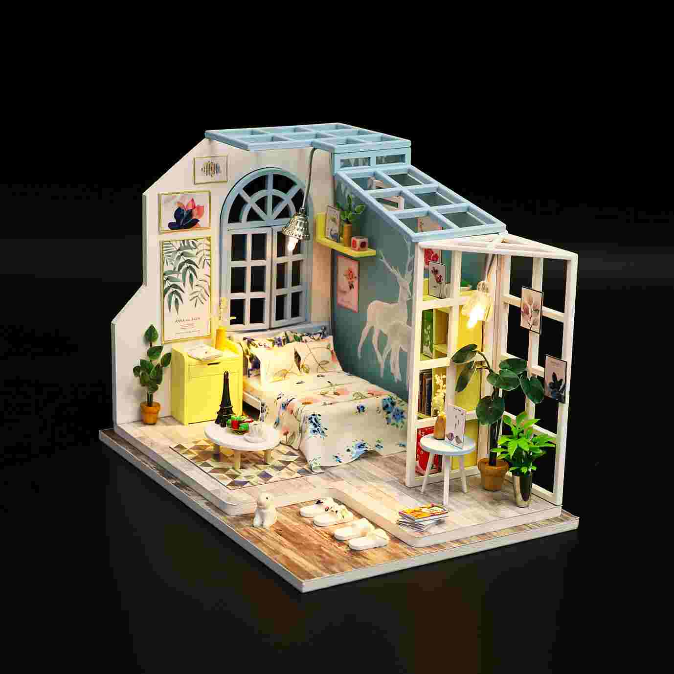 The model with room furniture, LED lights, and various daily supplies. It is a very lifelike and beautiful structure.