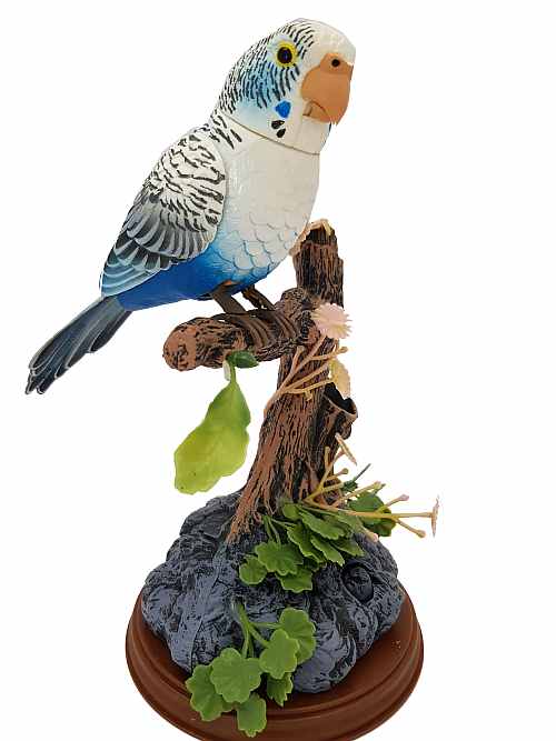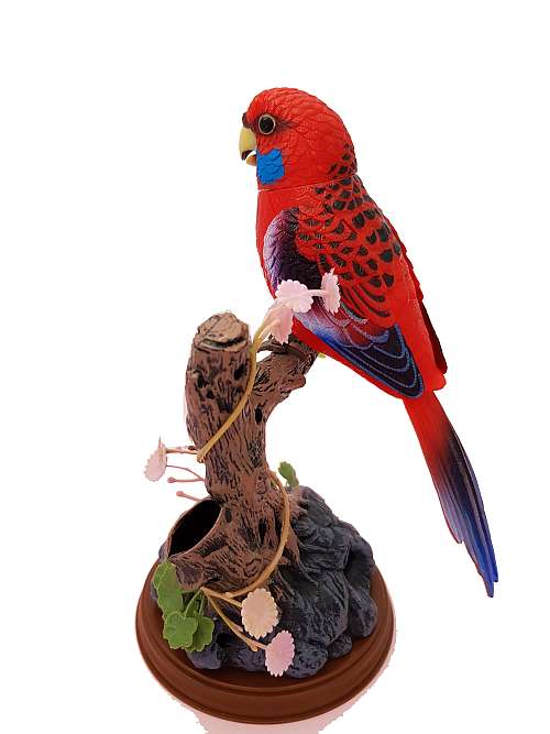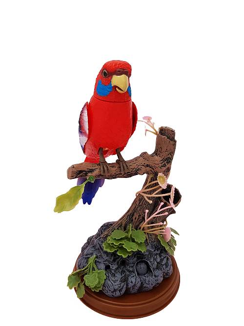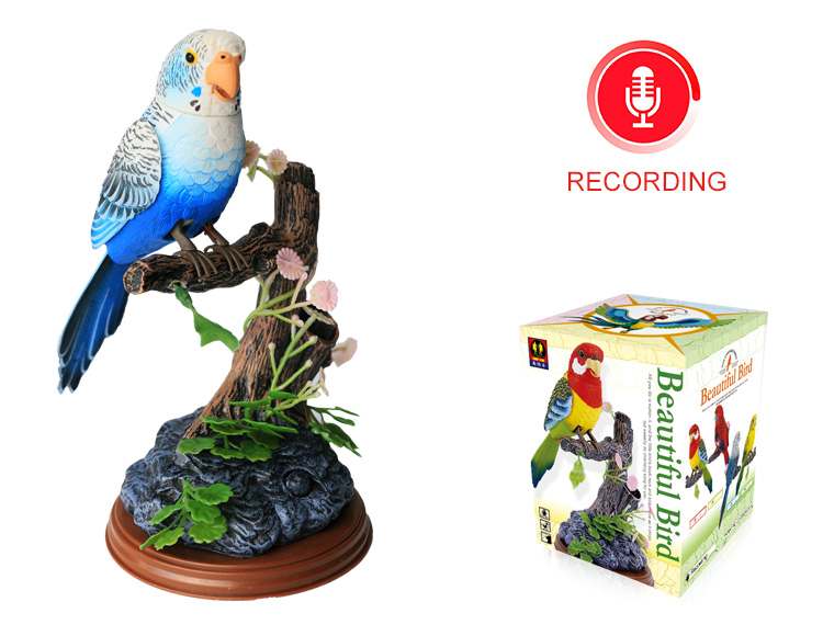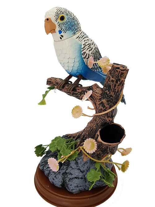 This parrot bird magically comes alive whenever you clap your hands or make any sound. Standing on pen holder rock and log, the birds will sing, chirp and talk in a wonderful voice and move their beak, neck, body, and wings in a realistic fashion.