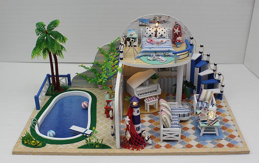 DIY M032 'Blue Coast‘ Wooden Kids Toy Miniature Doll House w/ LEDs and Dust Proof Cover