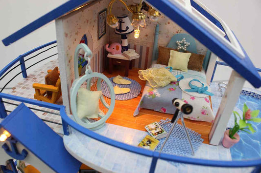IIE CREATE Blue Coast (K024) Assemble Wooden Miniature Dollhouse w/LEDs, Dust Proof Cover and Glues Birthday Gifts