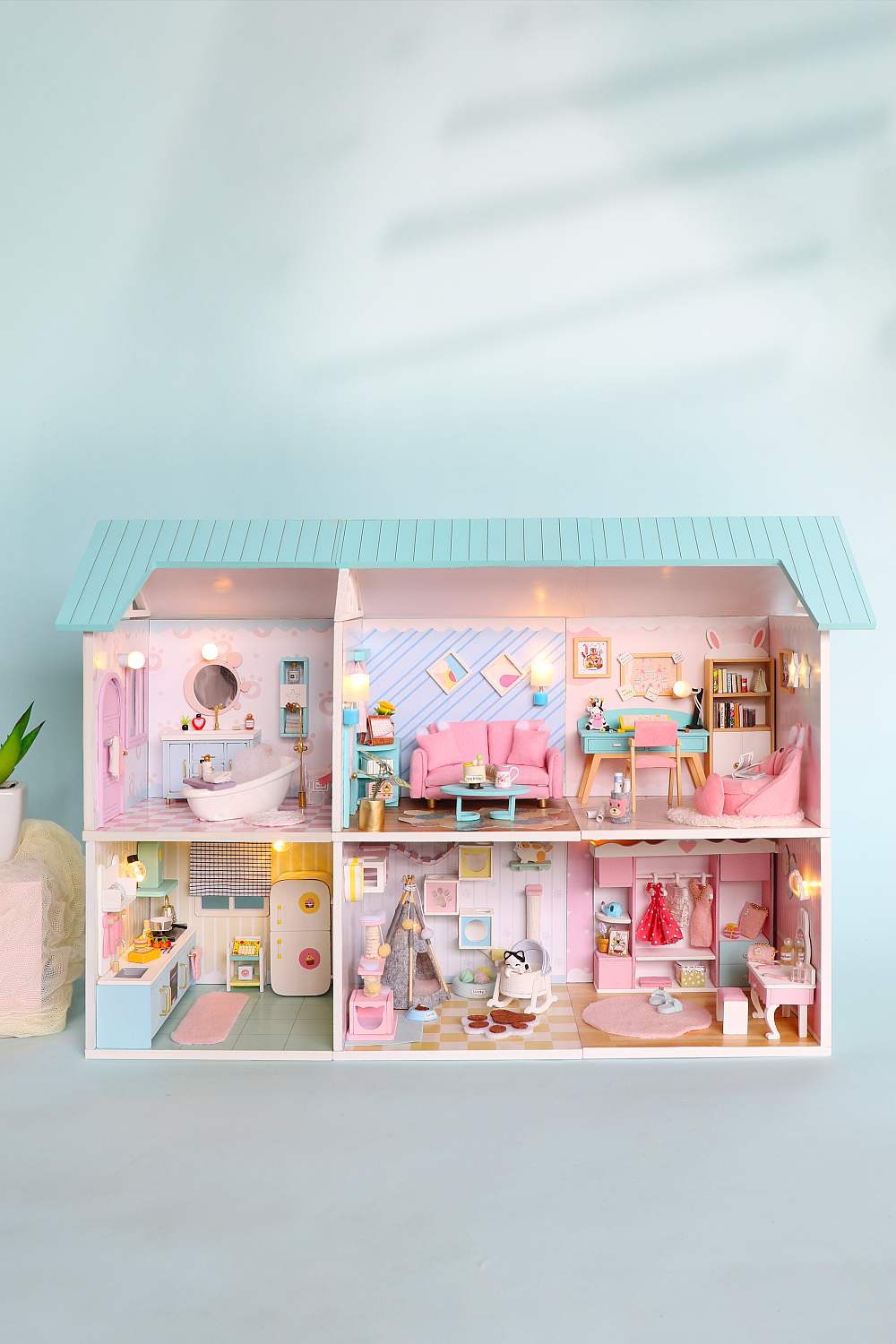Six-in-one dollhouse includes Sunny Living Room (S2004), Study Room (S2006), Happy Kitchen (S2007), Pet's Home (S2009), Cosy Bathroom (S2010), Lovely Cloakroom (S2011). Roofs are included in this bundle.
