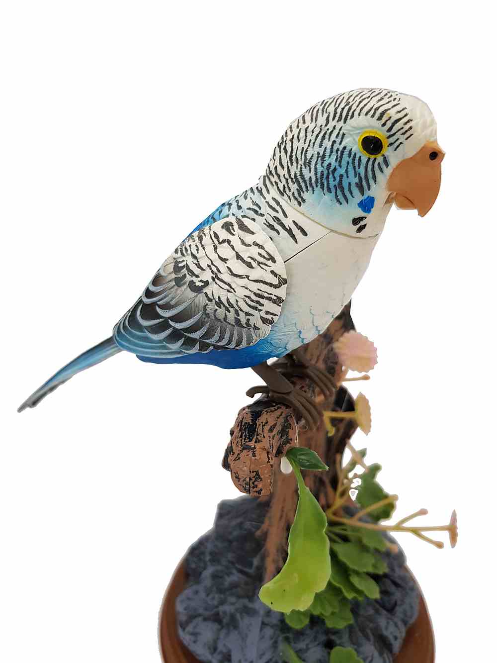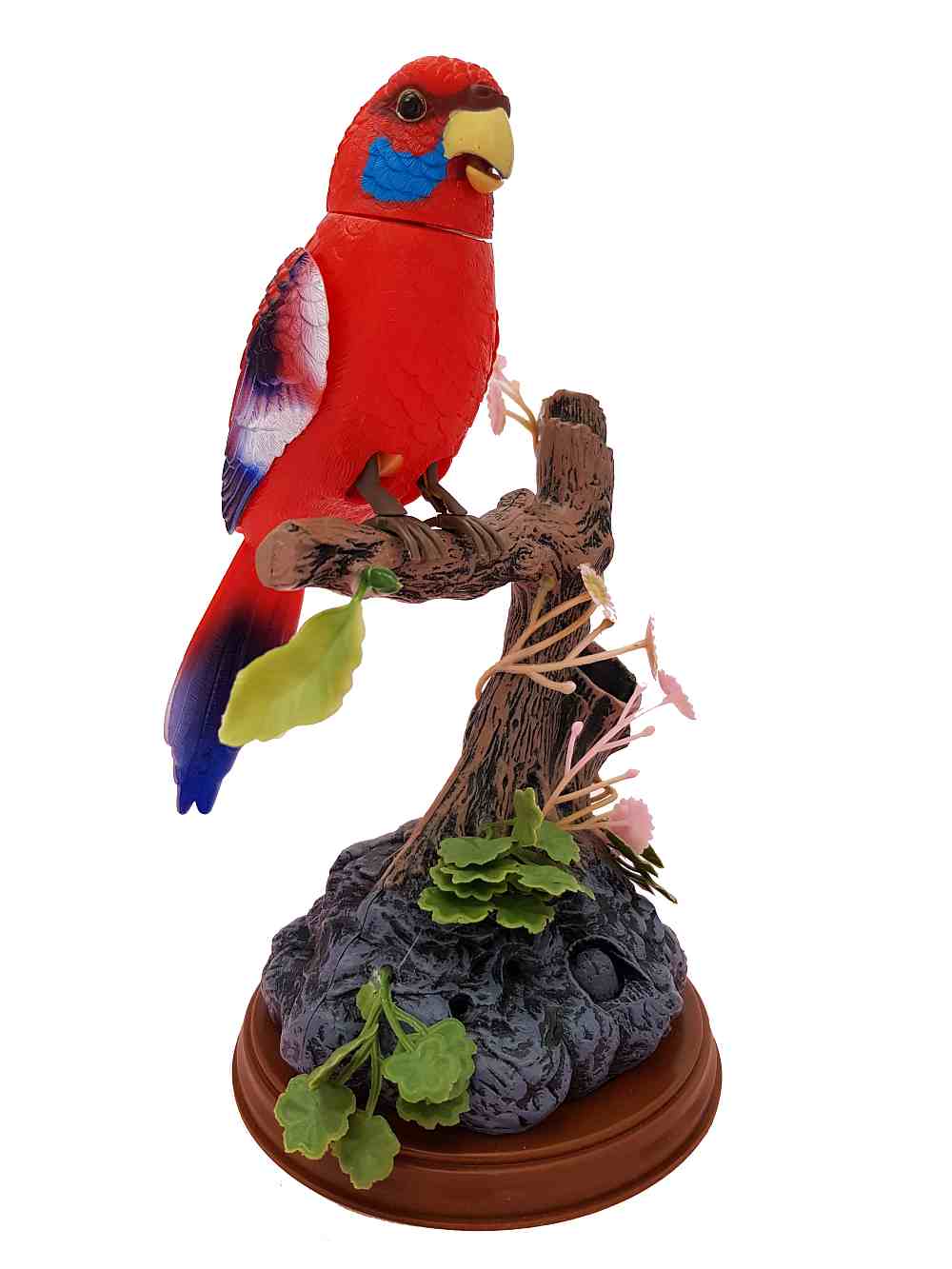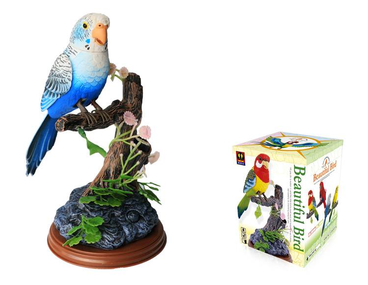 This parrot bird magically comes alive whenever you clap your hands or make any sound. Standing on pen holder rock and log, the birds will sing and chirp in a wonderful voice and move their beak, neck, body, and wings in a realistic fashion.